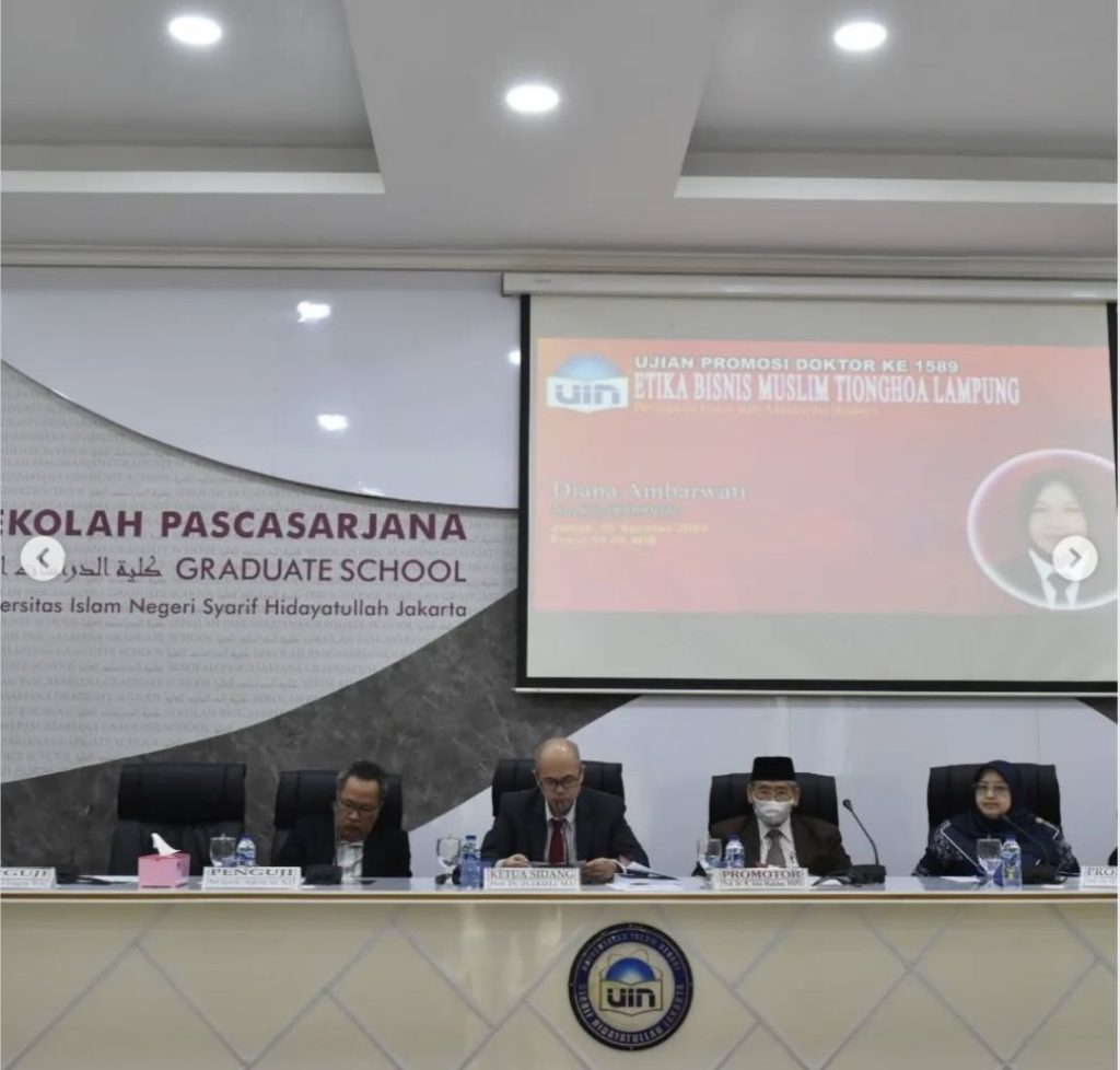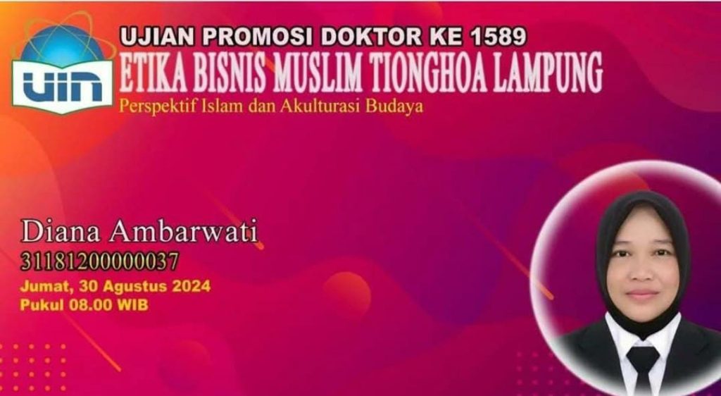 Pascasarjana dengan bangga menyampaikan ucapan selamat dan apresiasi kepada Dr. Diana Ambarwati, M.E.Sy yang berhasil meraih gelar Doktor Ekonomi Islam melalui ujian promosi doktor yang berlangsung secara luring. Dalam sidang terbuka tersebut, Diana mempresentasikan disertasi berjudul “Etika Bisnis Muslim Tionghoa Lampung Perspektif Islam dan Akulturasi Budaya”, sebuah kajian mendalam mengenai karakteristik etika bisnis dalam komunitas Muslim Tionghoa Lampung.