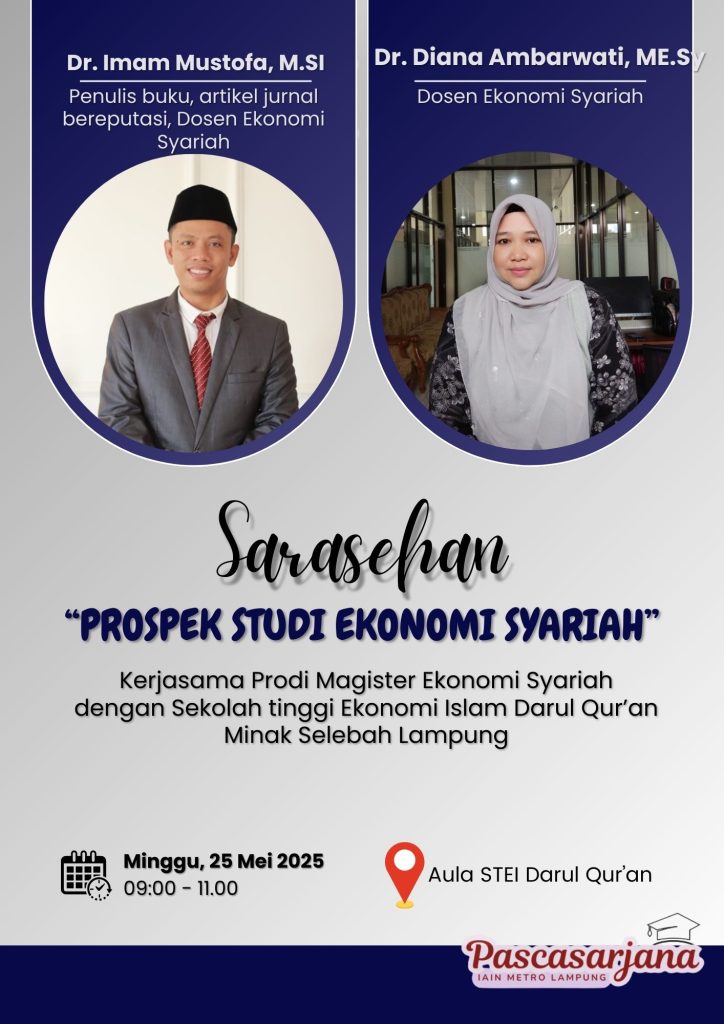 Lampung Timur, 25 Mei 2025 — Dosen prodi Magister Ekonomi Syariah menjadi narasumber pada kegiatan Sarasehan Prospek Studi Ekonomi Syariah, yang berlangsung di Aula Kampus Sekolah Tinggi Ekonomi Islam Darul Qur’an Minak Selebah Lampung pada Minggu, 25 Mei 2025. Kegiatan ini menjadi ajang dialog akademik yang mempertemukan mahasiswa, dosen, dan praktisi dalam membahas masa depan studi ekonomi syariah di tengah dinamika perkembangan ekonomi nasional dan global.