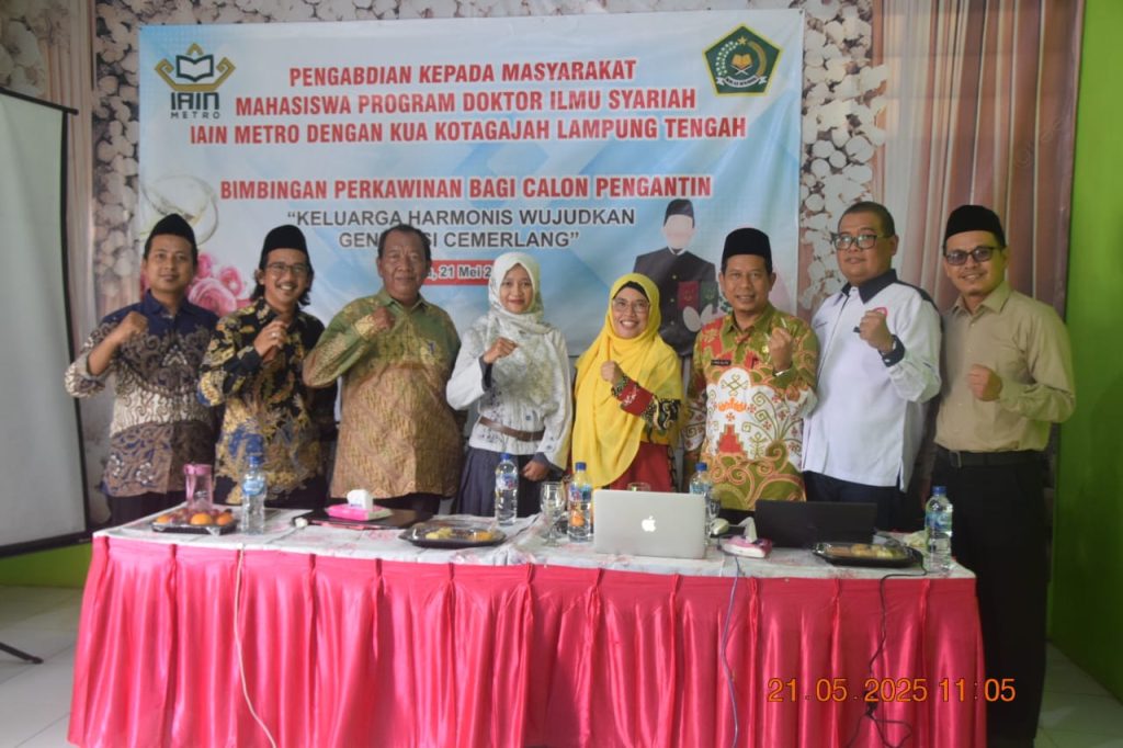 KUA Kota Gajah, (Rabu 21/5/2025) — Dalam rangka implementasi Tri Dharma Perguruan Tinggi, khususnya pada aspek Pengabdian kepada Masyarakat, Program Studi Doktor Ilmu Syariah Institut Agama Islam Negeri (IAIN) Metro berkolaborasi dengan Kantor Urusan Agama (KUA) Kecamatan Kota Gajah, Kabupaten Lampung Tengah, menyelenggarakan kegiatan Bimbingan Perkawinan bagi Calon Pengantin.