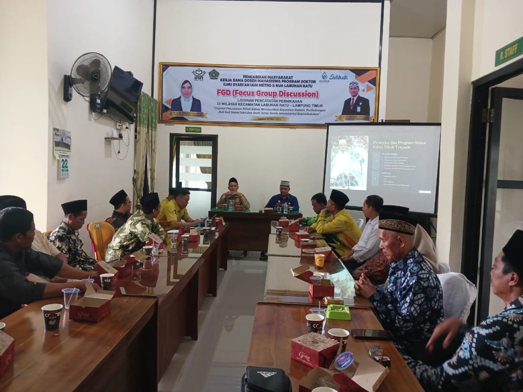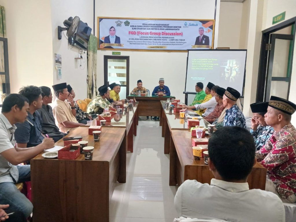 KUA Labuhan Ratu-Dalam rangka merespons persoalan nikah sirri dan pernikahan usia dini yang masih menjadi tantangan sosial di sejumlah wilayah, Kantor Urusan Agama (KUA) Kecamatan Labuhan Ratu menggelar kegiatan edukatif bersama mahasiswa Program Doktor Ilmu Syariah IAIN Metro. Kegiatan yang berlangsung pada Kamis, 22 Mei 2025, di Aula KUA Labuhan Ratu ini menghadirkan jajaran Tokoh Agama, Kepala Desa, Penyuluh Agama, dan Penghulu sebagai bagian dari upaya penguatan literasi hukum dan agama di tingkat masyarakat akar rumput.
