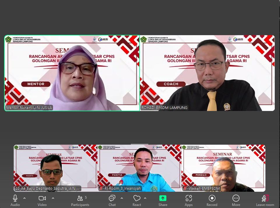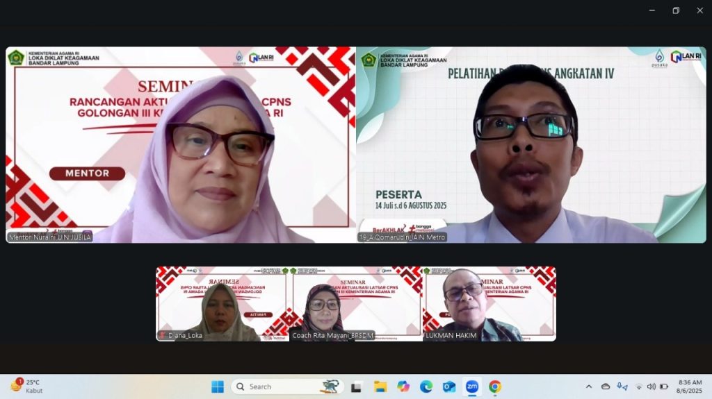 Metro, 6 Agustus 2025 – CPNS Pascasarjana UIN Jurai Siwo Laksanakan Seminar Rancangan Aktualisasi Melalui Zoom Kedua Calon Pegawai Negeri Sipil (CPNS) yaitu A. Qomarudin dan Bayu Depnanto Saputra dengan bimbingan mentor ibu Nuraini, S.E., M.M. yang bertugas di lingkungan Pascasarjana UIN Jurai Siwo Lampung telah sukses melaksanakan Seminar Rancangan Aktualisasi sebagai bagian dari proses pelatihan dasar (Latsar) CPNS. Kegiatan ini dilaksanakan secara daring melalui platform Zoom Meeting pada Rabu, 6 Agustus 2025.