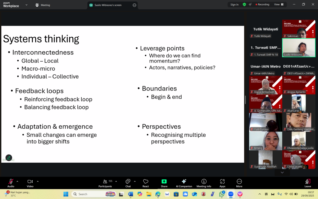 Menjawab kompleksitas tersebut, Dr. Susilo menawarkan pendekatan systems thinking. Akademisi perlu memahami keterhubungan antar faktor—global-lokal, makro-mikro, individu-kolektif—dan bagaimana perubahan kecil bisa memicu pergeseran besar dalam masyarakat. Ia menekankan pentingnya feedback loops (penguatan maupun penyeimbang), menemukan leverage points sebagai momentum perubahan, serta mengakui keragaman perspektif.