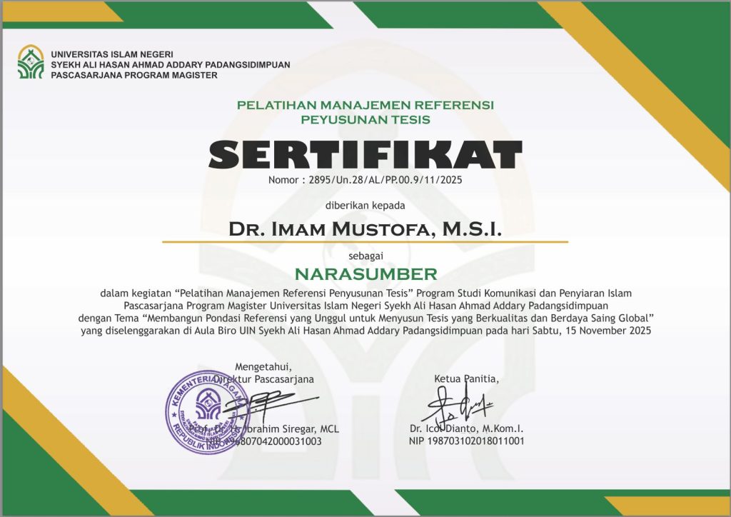 Program Pascasarjana Universitas Islam Negeri (UIN) Syekh Ali Hasan Ahmad Addary Padangsidimpuan menyelenggarakan pelatihan manajemen referensi untuk mahasiswa Program Studi Komunikasi pada 15 November 2025. Kegiatan ini menghadirkan Dr. Imam Mustofa, M.Si., sebagai narasumber utama guna memberikan pemahaman dan keterampilan praktis dalam pengelolaan referensi sebagai bagian penting dari penyusunan tesis.
