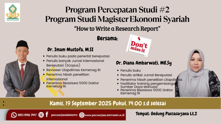 Metro – 29/09/2025- Program Studi Magister Ekonomi Syariah Pascasarjana UIN Jusila menggelar Guest Lecture pada Senin, 29 September 2025, pukul 09.00 WIB secara daring melalui platform Zoom Meeting. Acara ini menghadirkan narasumber internasional, Susilo Wibisono, Lecturer School of Psychology, College…